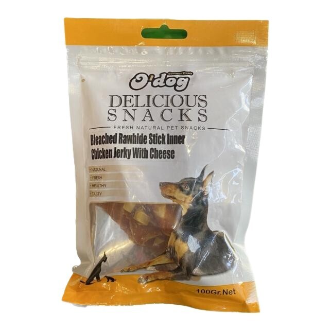 تشویقی سگ اوداگ مدل مرغ جرکی به همراه پنیر O'Dog Chicken & Cheese jerkeyوزن ۱۰۰ گرم