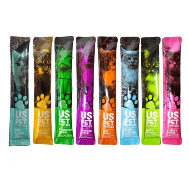 بستنی گربه یو اس پت ساخت کشور چین یک میان وعده عالی و خوشمزه برای گربه دلبندتان در طعم های: ، شترمرغ و بیوتین، کیتن (ریکاوری)، بوقلمون و علف گربه، بره و ویتامین، مرغ و سیب، بیف و تمشک، اردک و پاپایا، سالمون و میگو