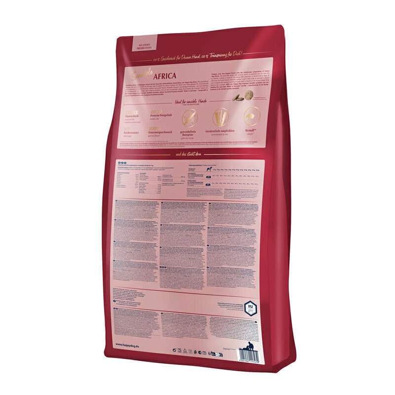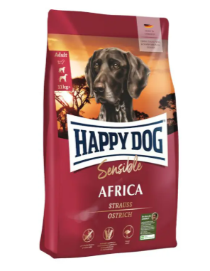 غذای سگ هپی داگ مدل آفریقا برای همه نژادهای متوسط و بزرگ بد غذا با گوارش حساس مناسب است.  این غذا ترکیب متعادلی از گوشت شتر مرغ و بدون گلوتن تهیه شده است. این غذا برای سگ هایی که به غذای خشک حساس هستند کاملا مناسب است.  این غذا تولید کشور آلمان است.