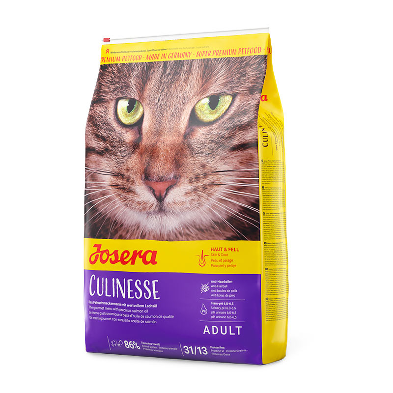 غذای خشک Josera Culinesse ویژه گربههای بالغ طراحی شده و ترکیبی از گوشت پرندگان و ماهی سالمون با طعمی خوشایند و قابلیت هضم بالا ارائه میدهد. این محصول با مقادیر مناسب چربی و اسیدهای چرب امگا 3 و امگا 6 و مولتی ویتامین، به سلامت پوست و مو و افزایش درخشندگی آن کمک میکند. همچنین pH کنترلشده این غذا از تشکیل سنگهای ادراری جلوگیری میکند و بدون رنگ، طعمدهنده و مواد نگهدارنده مصنوعی است.