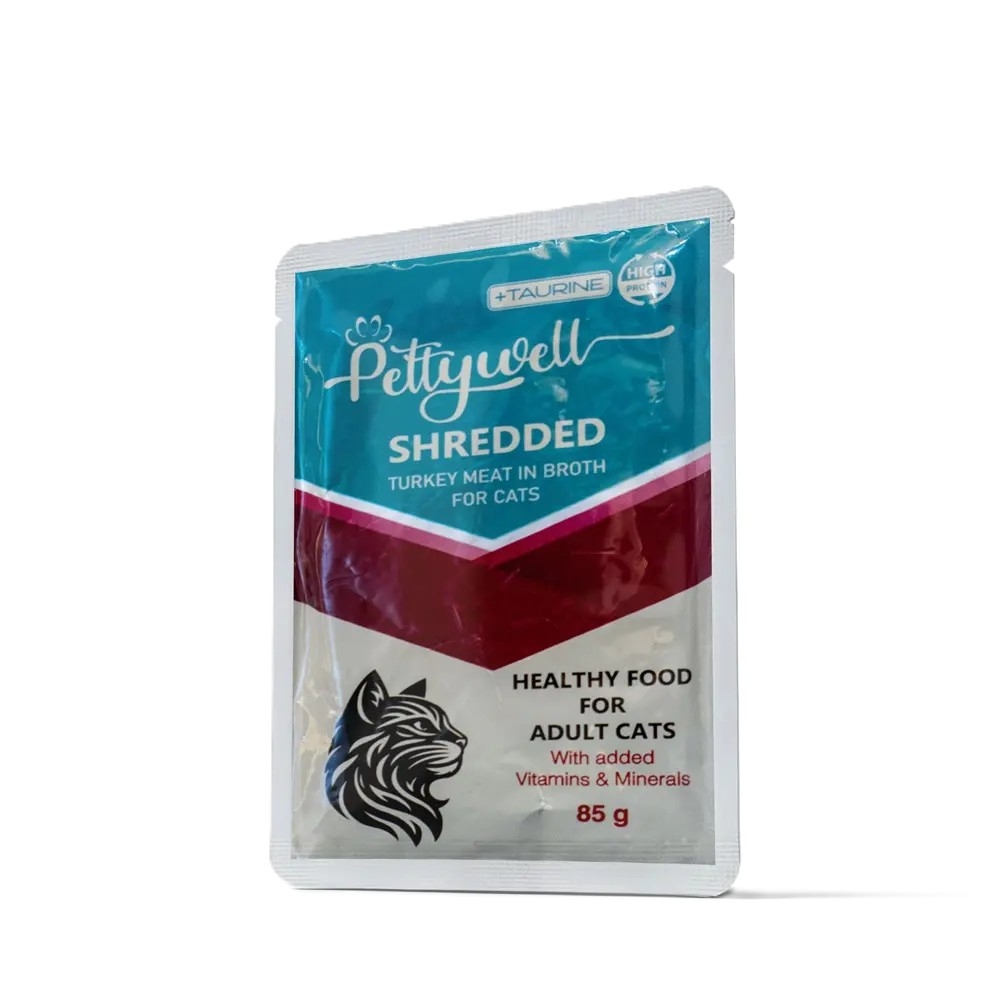 غذای گربه مدل شردد طعم بوقلمون پتی‌وِل PettyWell وزن 85 گرم