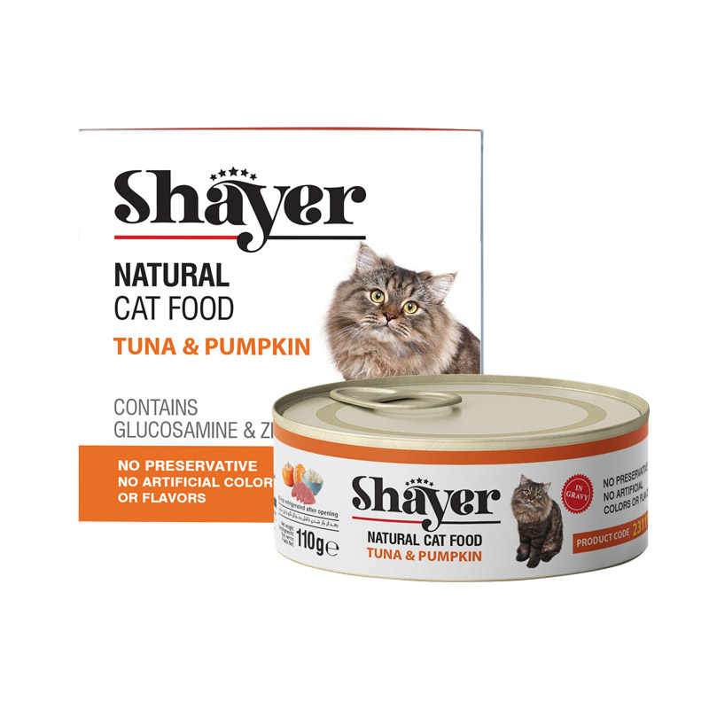 کنسرو غذای گربه شایر با طعم ماهی تن و کدو حلوایی Shayer Natural With Tuna & Pumpkin وزن 110 گرم