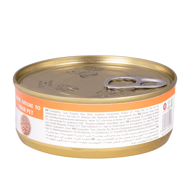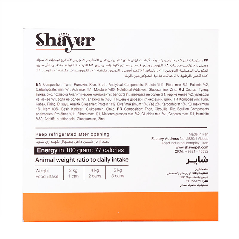 کنسرو شایر با طعم ماهی تن و کدو حلوایی، غذایی کامل و مغذی برای گربه‌های بالغ و تمامی نژادها. این محصول با تامین انرژی، ویتامین‌ها و مواد معدنی ضروری، به تقویت مغز، سلامت دستگاه گوارش و بهبود کیفیت زندگی گربه کمک می‌کند.