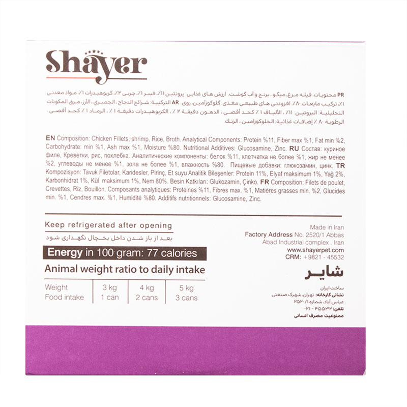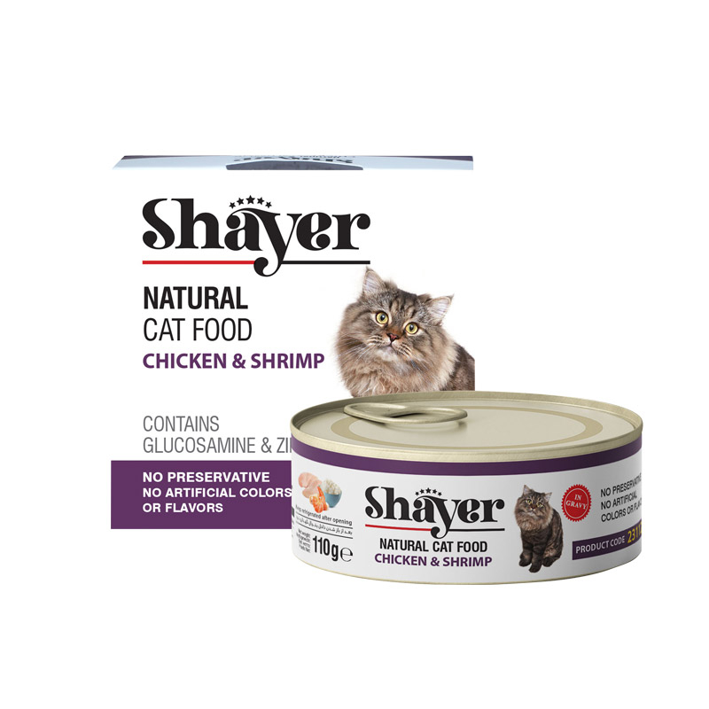 کنسرو غذای گربه با طعم مرغ و شاه میگو شایر Shayer Natural With Chicken & Shrimp وزن 110 گرم