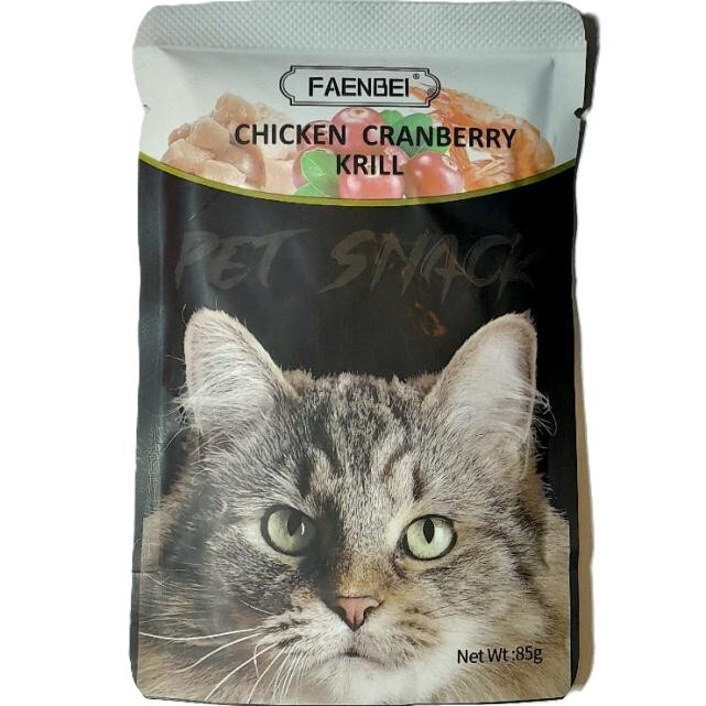 پوچ گربه فنبی مدل پت اسنک طعم مرغ و میگو و کرنبری Faenbei Pet snack with Chicken Cranberry and Krill وزن 85 گرم