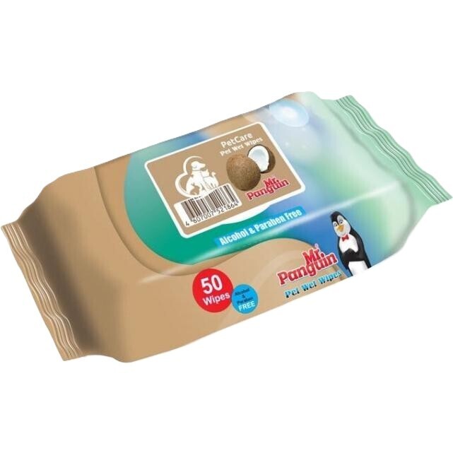 دستمال مرطوب پاکتی رایحه دار مستر پنگوئین با رایحه نارگیل Mr. Penguin Pet Wipes coconat بسته 50 عددی